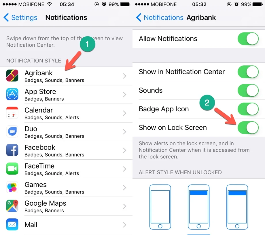 - Bước 2: Tiếp theo, bạn tìm đến ứng dụng cần vô hiệu hóa thông báo và tắt tùy chọn Show on Lock Screen (hiển thị trên màn hình khóa). Kể từ lúc này, mỗi khi có thông báo mới, ứng dụng sẽ chỉ hiển thị biểu tượng trên thanh trạng thái.