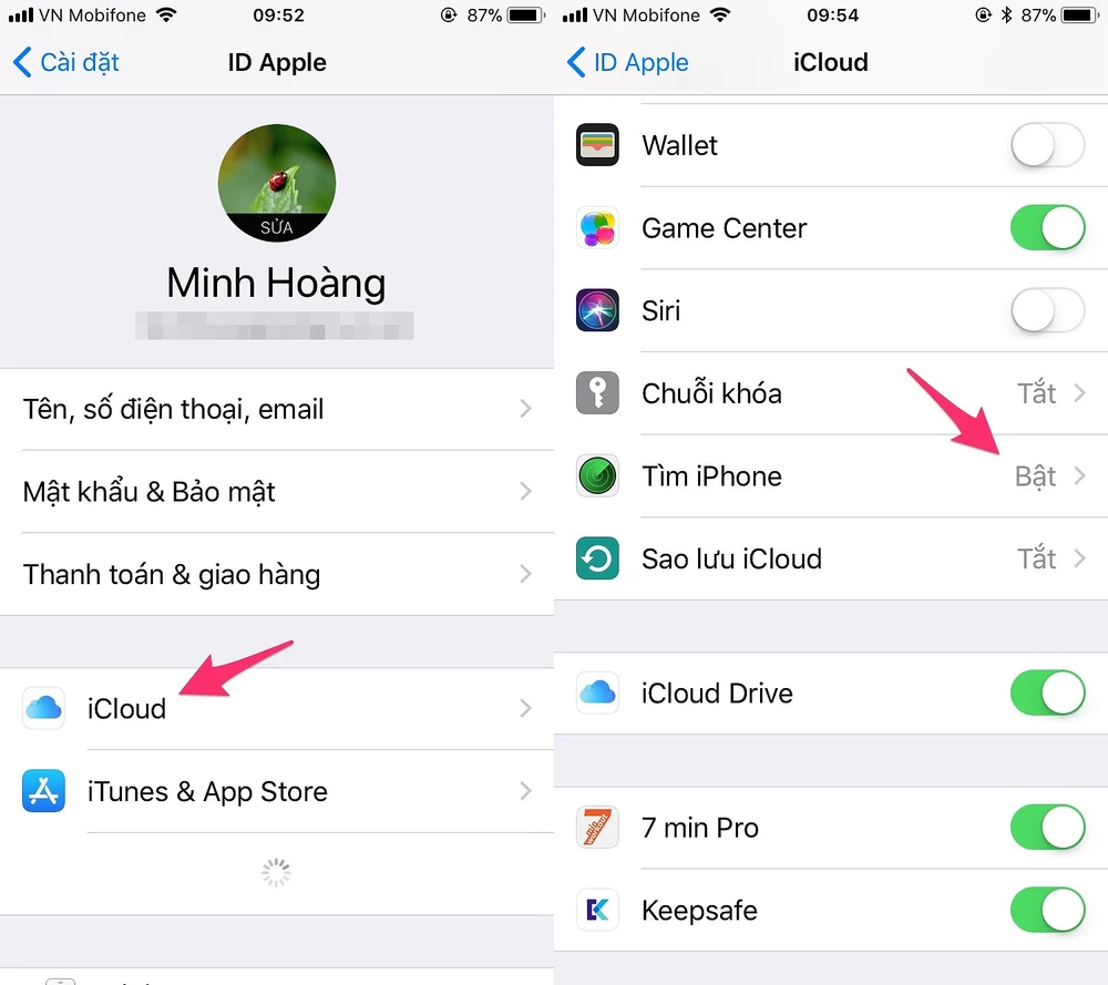 Để thực hiện, bạn hãy vào Settings (cài đặt) > Tên tài khoản > iCloud và đăng nhập bằng tài khoản Apple ID, sau đó kéo xuống bên dưới và kích hoạt tùy chọn Find my iPhone (tìm iPhone).
