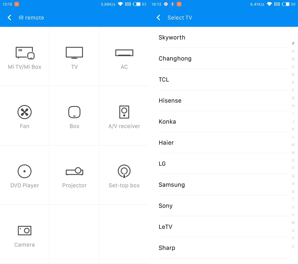Nếu ứng dụng trên không tương thích với các thiết bị điện tử tại nhà, bạn hãy thử cài đặt Mi Remote cho smartphone tại địa chỉ http://bit.ly/mi-remote. Đầu tiên, bạn hãy bấm vào biểu tượng dấu cộng ở góc trên bên trái và chọn loại thiết bị cần điều khiển gồm TV, Mi Box, AC (máy điều hòa), Fan (quạt), Box (TV Box), A/V receiver (amply), DVD Player (đầu đĩa)… và Camera (máy ảnh). Tiếp theo, bạn hãy chọn thương hiệu đang sử dụng và bấm thử các nút chức năng do ứng dụng đưa ra.