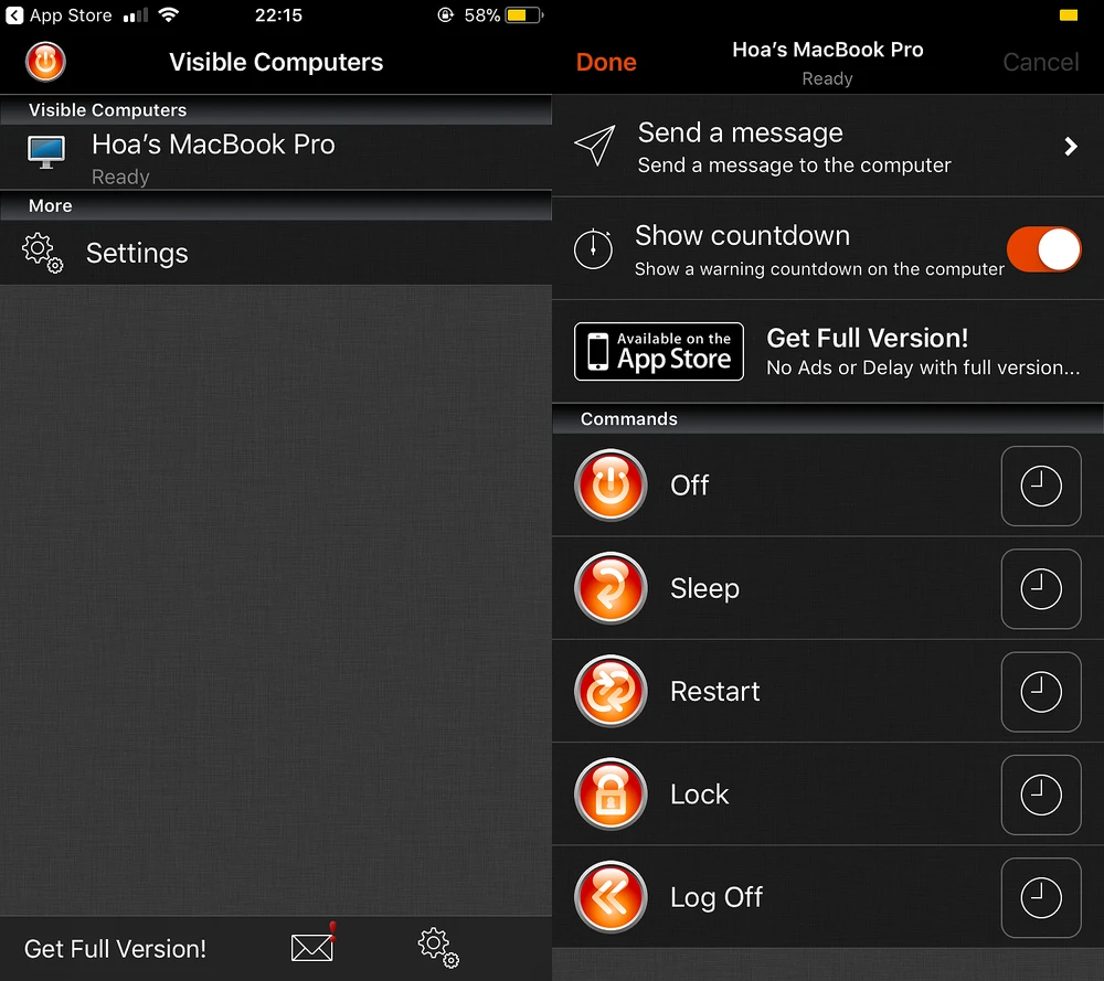 Khi hoàn tất, bạn chỉ cần mở ứng dụng Off Remote trên iPhone, chạm vào tên máy tính cần tắt từ xa. Lúc này sẽ có các tùy chọn như Off (tắt máy), Sleep (ngủ), Restart (khởi động lại), Lock (khóa máy) và Log Off (đăng xuất). Khi thực thi một lệnh bất kỳ, trên màn hình sẽ xuất hiện thông báo và bắt đầu đếm lùi 10 giây.