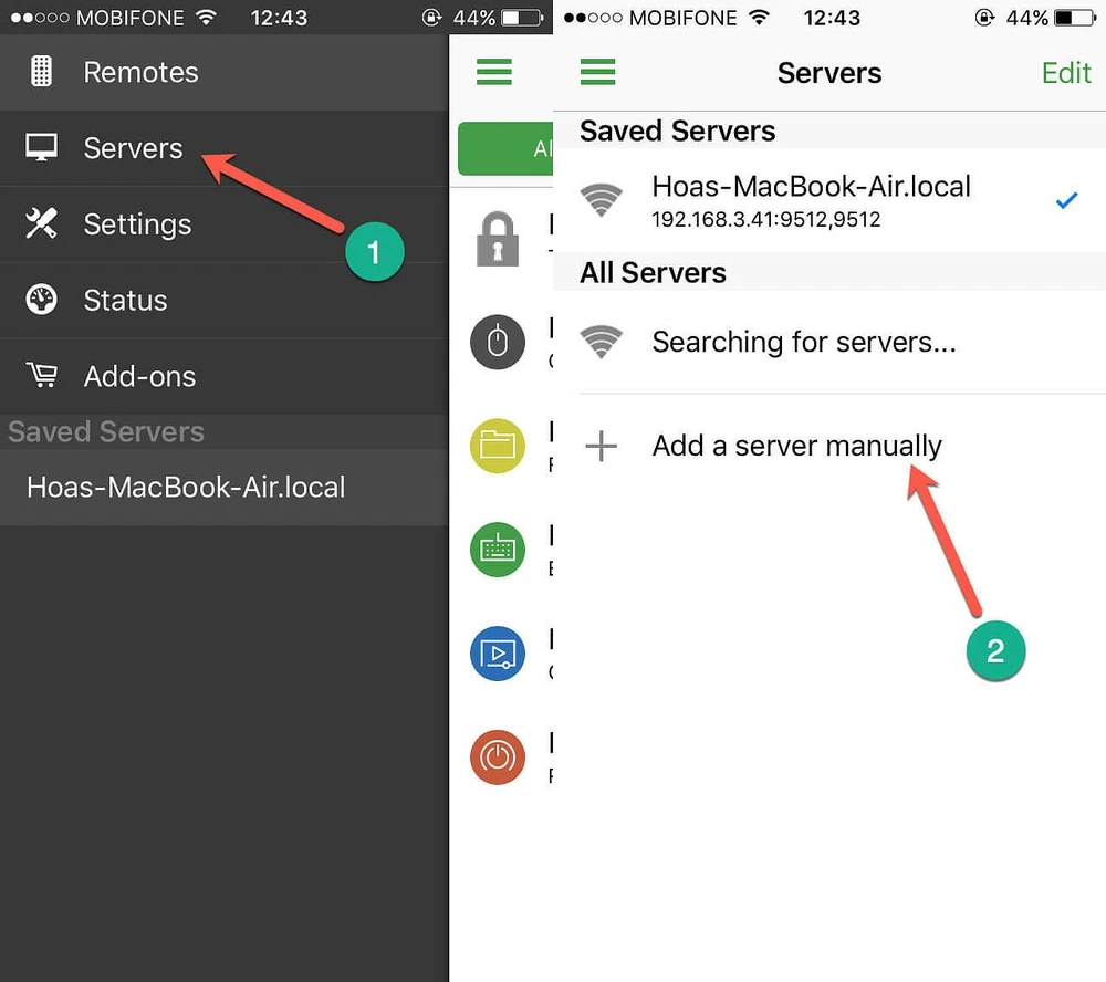 Khi hoàn tất, bạn hãy mở Unified Remote trên smartphone, chạm vào biểu tượng menu ở góc trên bên trái, chọn Server và kết nối với máy tính hoặc thực hiện việc này theo cách thủ công (Add a server manually). Lưu ý, cả smartphone và máy tính đều phải kết nối cùng mạng WiFi, Unified Remote sẽ không hoạt động khi bạn xài 3/4G.