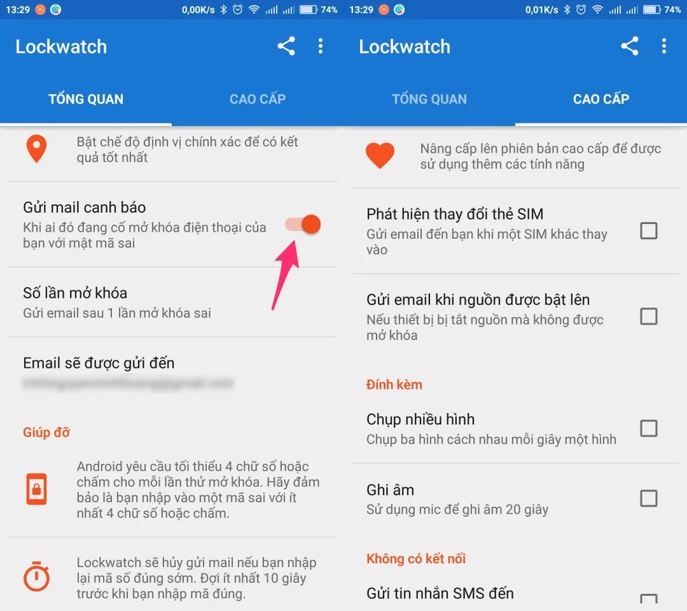 - Bước 3: Mặc định, ứng dụng sẽ gửi thông tin của kẻ trộm đến email khi họ mở khóa sai một lần. Nếu muốn điều chỉnh lại thông số trên, bạn chỉ cần bấm vào mục Number of unlock attempts (số lần mở khóa). Lưu ý, email có thể bị đưa vào thư mục Spam, do đó, bạn cần kiểm tra thật kỹ mọi thứ và đánh dấu email là Not Spam (không phải thư rác).