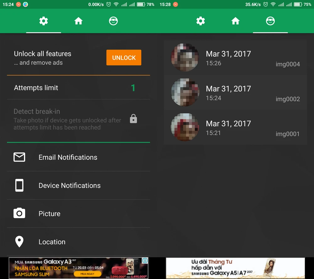 Một khi được cài đặt, Third Eye http://bit.ly/2HiBF2Y sẽ liên tục chạy nền và tự động chụp lại hình ảnh kẻ trộm bằng camera trước khi họ nhập sai mã PIN hoặc hình vẽ (pattern). Vì là ứng dụng miễn phí nên đôi khi bạn sẽ thấy xuất hiện quảng cáo đi kèm. Mặc định, Third Eye có cách thức hoạt động tương tự như Lockwatch nhưng mọi thông tin chỉ được lưu trữ trên thiết bị.