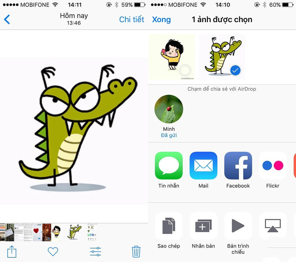Tiếp theo, bạn hãy đánh dấu các hình ảnh, dữ liệu cần chuyển và bấm vào biểu tượng nút Share (chia sẻ) ở góc trái bên dưới, chọn thiết bị nhận trong mục Tap to share with Airdrop (chạm để chia sẻ với AirDrop).