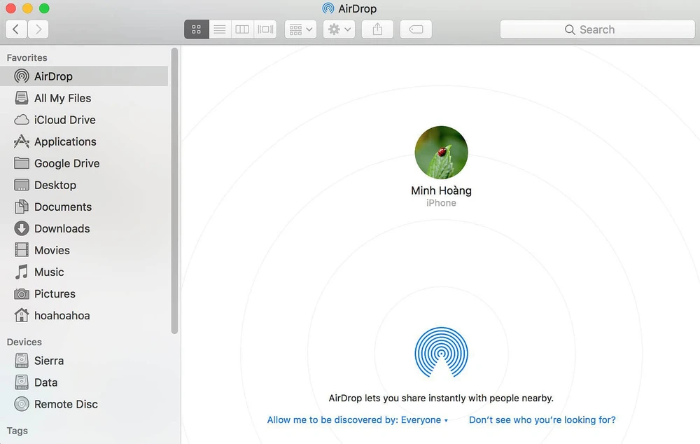 Nhấp vào mục AirDrop và thiết lập là Everyone (mọi người) hoặc chọn Contacts Only (chỉ chia sẻ dữ liệu với những người nằm trong danh bạ), thực hiện tương tự trên MacBook. Sau đó, bật WiFi và Bluetooth trên cả hai thiết bị.