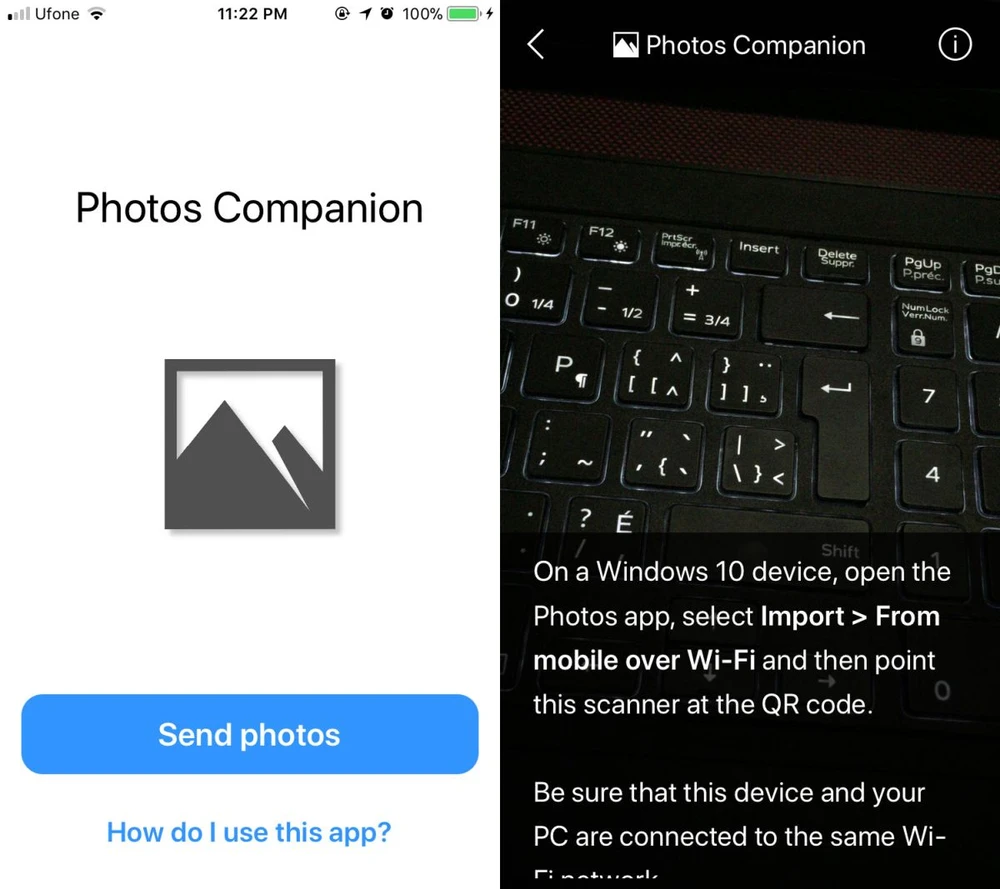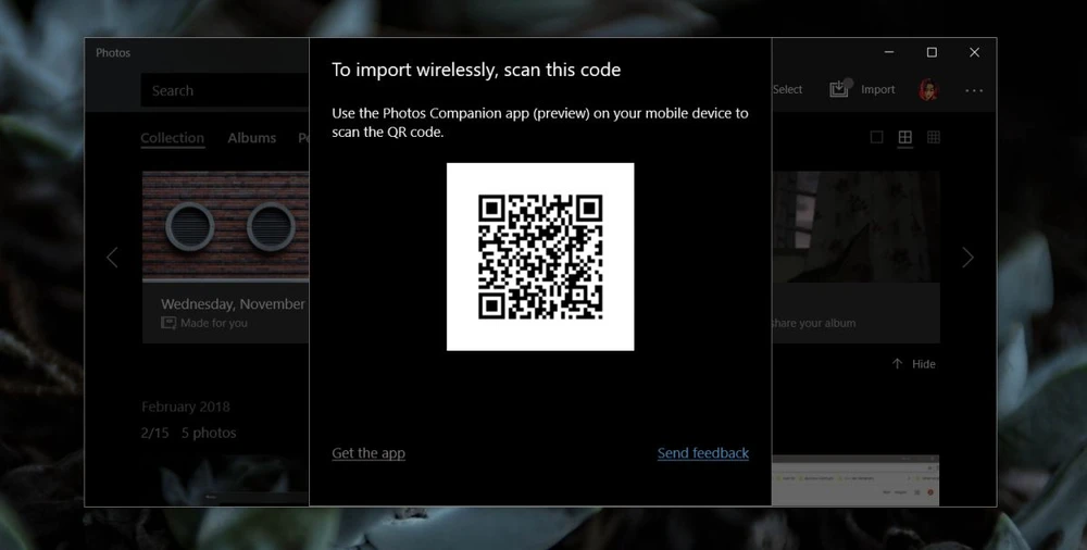 Tiếp theo, người dùng cần cài đặt ứng dụng Photos Companion cho smartphone tại địa chỉ https://goo.gl/eExMkW, tương thích Android và iOS. Khi hoàn tất, bạn hãy chạm vào nút Send Photos và cấp quyền truy cập, sau đó sử dụng smartphone và quét QR Code trên máy tính để kết nối hai thiết bị.