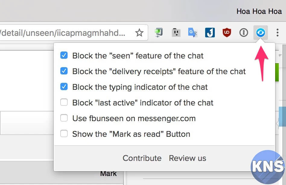 - Bước 2: Khi hoàn tất, biểu tượng của tiện ích sẽ nằm ở cuối thanh địa chỉ. Tại đây sẽ bao gồm một số tùy chọn như Block the “seen” feature of the chat (tắt tính năng “đã xem”), Block the typing indicator of the chat (tắt tính năng “đang trả lời”), Block “last active” indicator of the chat (tắt thời gian xuất hiện lần cuối trên Messenger)… và một số tùy chọn khác mà bạn có thể tìm hiểu thêm trong quá trình sử dụng.