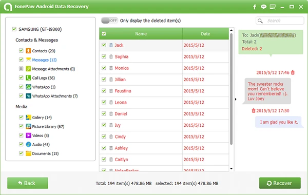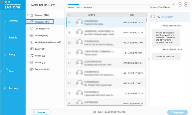 - Bước 5: Khi quét hoàn tất, chương trình sẽ liệt kê toàn bộ những tin nhắn đã xóa khỏi điện thoại, việc bạn cần làm lúc này là đánh dấu các mục cần khôi phục rồi nhấn Recover.