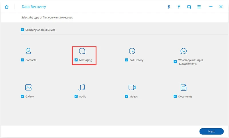 - Bước 3: Tiếp theo, bạn cần kích hoạt tùy chọn USB Debugging (gỡ lỗi USB) trên smartphone theo hướng dẫn ở phần 1 bên trên, sau đó kết nối điện thoại vào máy tính thông qua cáp USB. Trong khuôn khổ bài viết, chúng ta chỉ quan tâm đến việc khôi phục tin nhắn đã xóa nên chỉ cần đánh dấu vào mục Messaging rồi nhấn Next.
