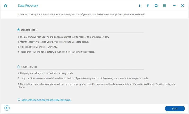 - Bước 4: Dr.fone hỗ trợ đến hai chế độ khôi phục dữ liệu gồm Standard Mode (chế độ bình thường, thời gian quét nhanh) và Advanced Mode (chế độ nâng cao, thời gian quét lâu và kỹ hơn).