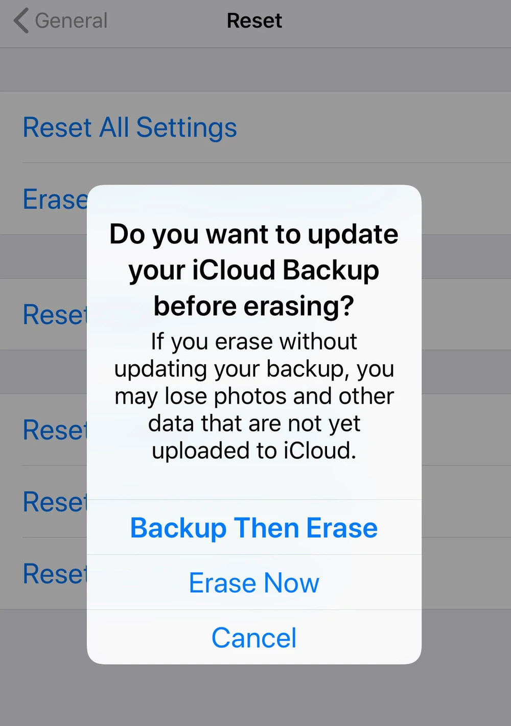 Tiếp theo, bạn hãy quay trở lại phần Settings (cài đặt), chọn General (cài đặt chung) - Reset (đặt lại) - Erase all Content and Settings (xóa tất cả nội dung và cài đặt) - Erase now (xóa ngay) trong cửa sổ vừa hiển thị.