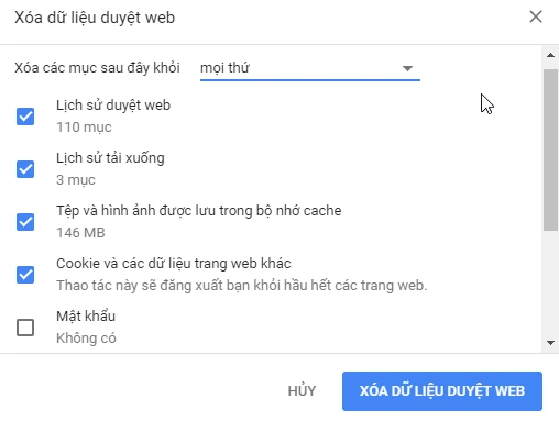 Lưu ý, bạn có thể lựa chọn mốc thời gian để xóa dữ liệu duyệt web trong ngày trước, tuần trước, tháng trước hoặc xóa toàn bộ mọi thứ.