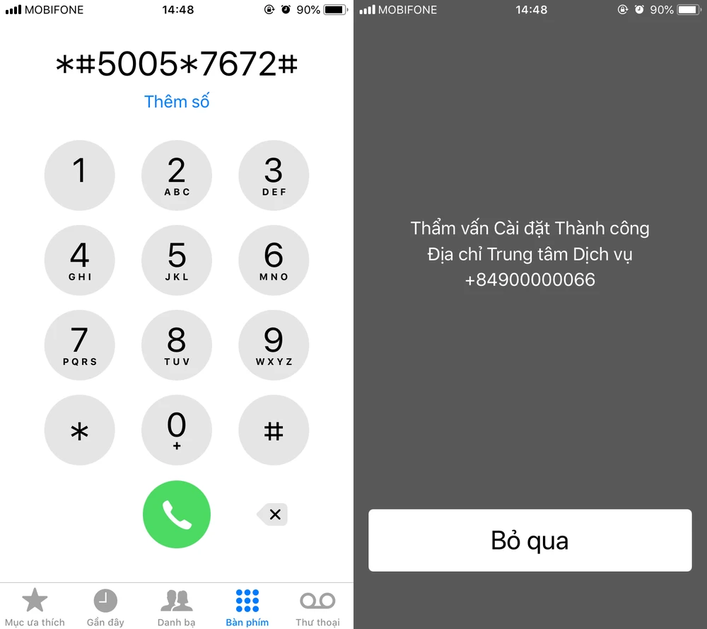 Nếu không đúng, người dùng có thể thiết lập lại bằng cách nhập **5005*7672*<số trung tâm dịch vụ ở trên># rồi nhấn Gọi. Ví dụ cho nhà mạng Viettel sẽ là **5005*7672*84980200030#.
