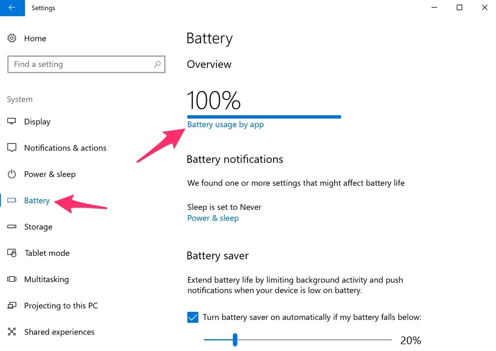 Đầu tiên, bạn hãy bấm vào menu Start và chọn Settings > System > Battery. Trong cửa sổ tiếp theo, người dùng chỉ cần kích vào tùy chọn Battery usage by app để kiểm tra danh sách các ứng dụng đang tiêu thụ pin.