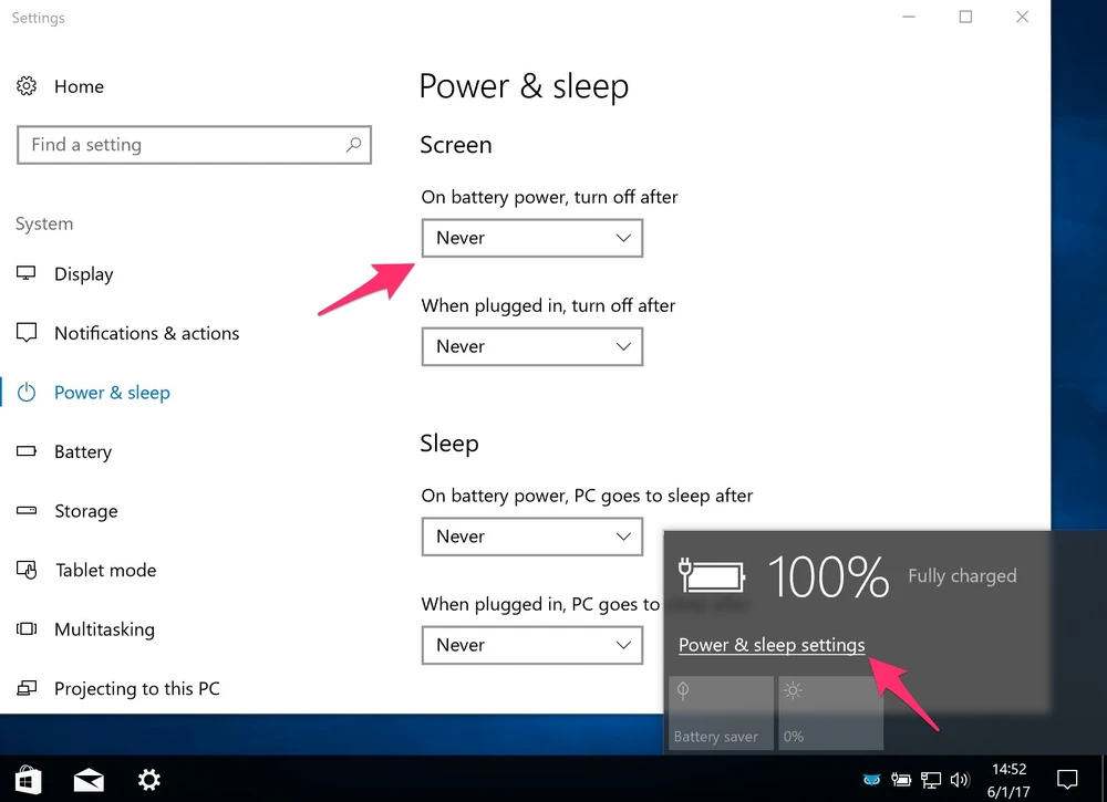 Bên cạnh đó, người dùng có thể cấu hình lại phần sử dụng điện bằng cách nhấp vào biểu tượng viên pin ở góc phải màn hình và chọn Power & sleep settings. Mặc định, các tùy chọn sẽ được thiết lập là Never, nghĩa là không bao giờ tắt màn hình hay chuyển sang chế độ Sleep.