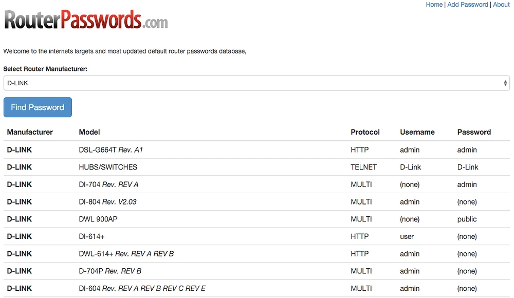 Ngoài ra, người dùng cũng có thể lên Google để tìm mật khẩu mặc định cho router theo cú pháp sau, ví dụ router Asus RT-AC5300 and default password hoặc truy cập trực tiếp vào địa chỉ http://routerpasswords.com./, lựa chọn thương hiệu router đang sử dụng rồi kích vào nút Find Password. Ngay lập tức nó sẽ trả về cho bạn một danh sách khá đầy đủ các model của dòng router này cùng tên đăng nhập và mật khẩu mặc định.