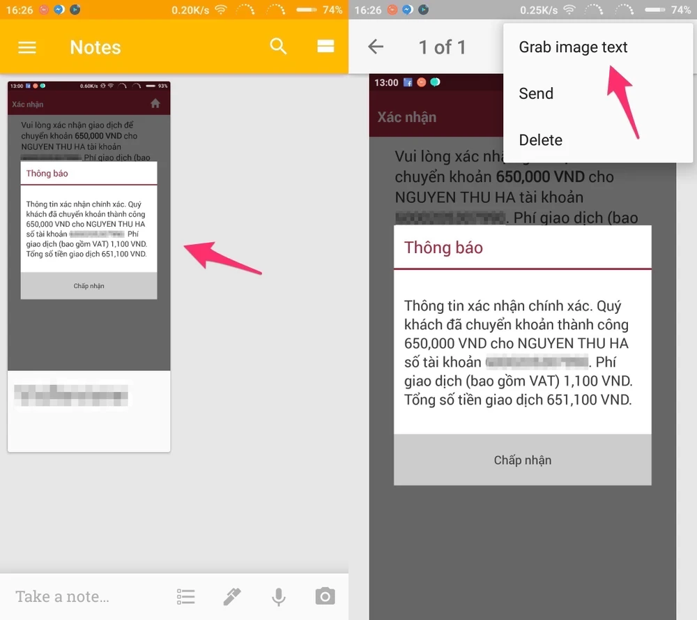 - Bước 3: Tiếp theo, bạn hãy bấm vào phần hình ảnh một lần nữa, sau đó nhấp vào biểu tượng ba chấm ở góc trên bên phải và chọn Grab image text. Văn bản được trích xuất sẽ nằm ngay bên dưới hình ảnh và được thêm vào ghi chú.
