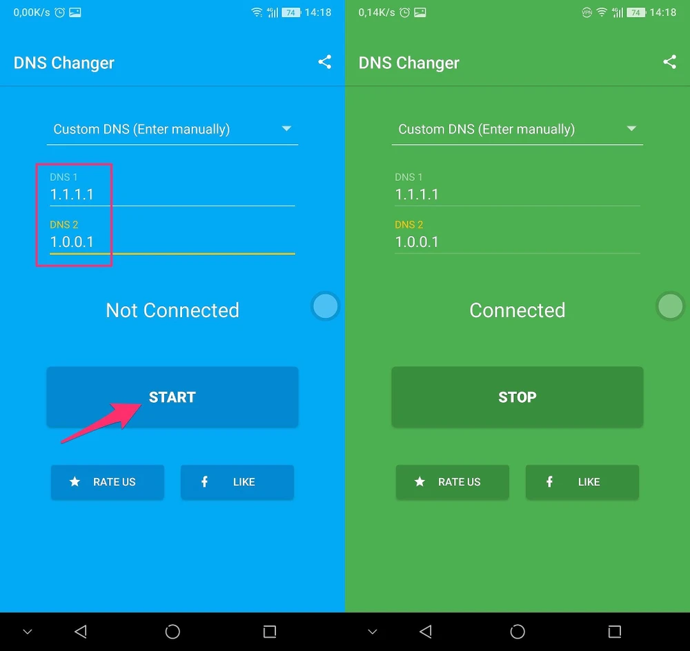 Giao diện của chương trình tương đối đơn giản, vì ứng dụng chưa cập nhật thêm Cloudfare DNS nên bạn cần phải nhập theo cách thủ công bằng cách bấm vào biểu tượng mũi tên và chọn Custom DNS. Sau đó nhập vào dãy số 1.1.1.1 và 1.0.0.1 rồi nhấn Start để bắt đầu. Nếu thành công, màn hình sẽ chuyển sang màu xanh lá cây và trên thanh thông báo sẽ hiển thị biểu tượng VPN.