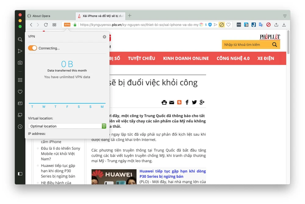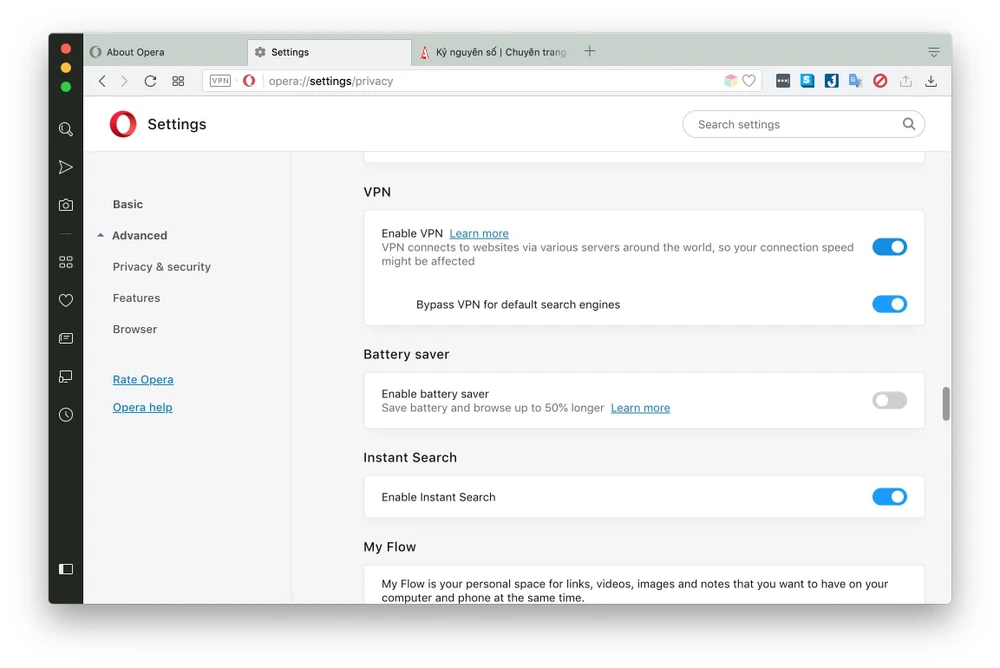 Đầu tiên, bạn hãy tải và cài đặt trình duyệt Opera tại địa chỉ https://www.opera.com/vi. Tiếp theo, bạn gõ vào thanh địa chỉ trình duyệt dòng lệnh opera://settings, chuyển sang mục Privacy & security > Enable VPN. Lúc này trên thanh địa chỉ sẽ xuất hiện thêm tùy chọn VPN, người dùng chỉ cần kích hoạt và lựa chọn máy chủ tương ứng.