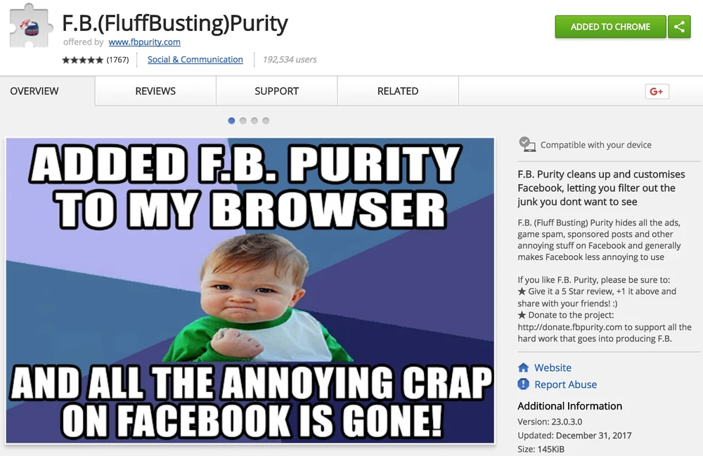 FB (FluffBusting) Purity được cung cấp miễn phí tại địa chỉ https://goo.gl/m54AhH, tương thích với Google Chrome, Cốc Cốc, Yandex, Opera... và các trình duyệt sử dụng mã nguồn mở Chromium.