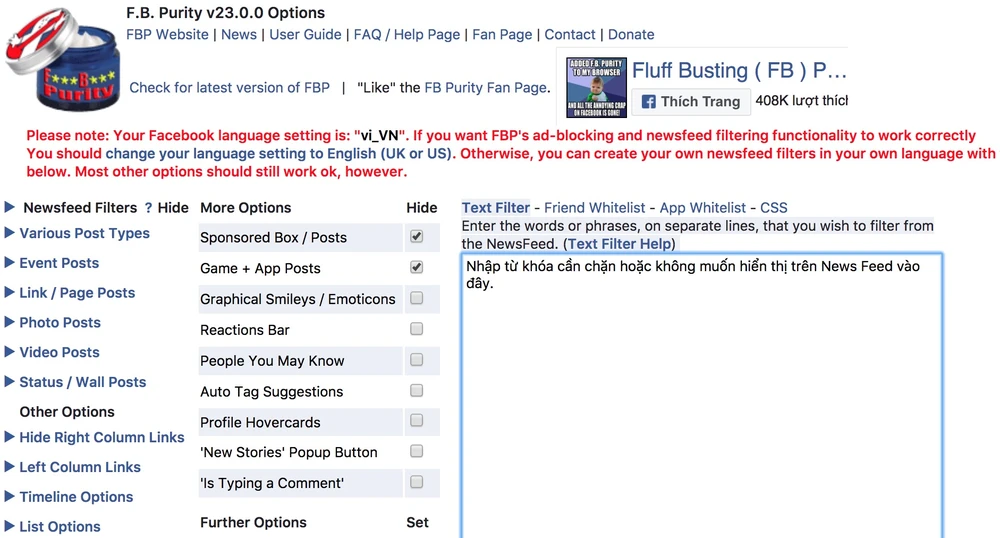 Ngoài ra, bạn cũng có thể sử dụng FB (FluffBusting) Purity để chặn các ứng dụng, trò chơi phiền toái trên Facebook trong phần thiết lập, đồng thời ngăn chặn các bài viết có chứa từ, cụm từ hoặc thời gian cụ thể bằng cách nhấp vào biểu tượng FBP bên cạnh tên tài khoản Facebook.