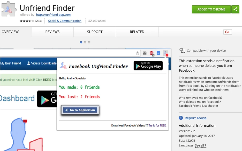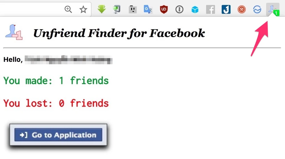 Để xem ai là người đã hủy kết bạn Facebook, người dùng chỉ cần nhấp vào biểu tượng Unfriend Finder và chọn Go to Application. Lưu ý, bạn cần phải vô hiệu hóa các tiện ích chặn quảng cáo để ứng dụng có thể hoạt động hiệu quả. Bên cạnh đó, Unfriend Finder cũng sẽ hiển thị thông báo nếu bạn bè trên Facebook tạm thời khóa tài khoản.