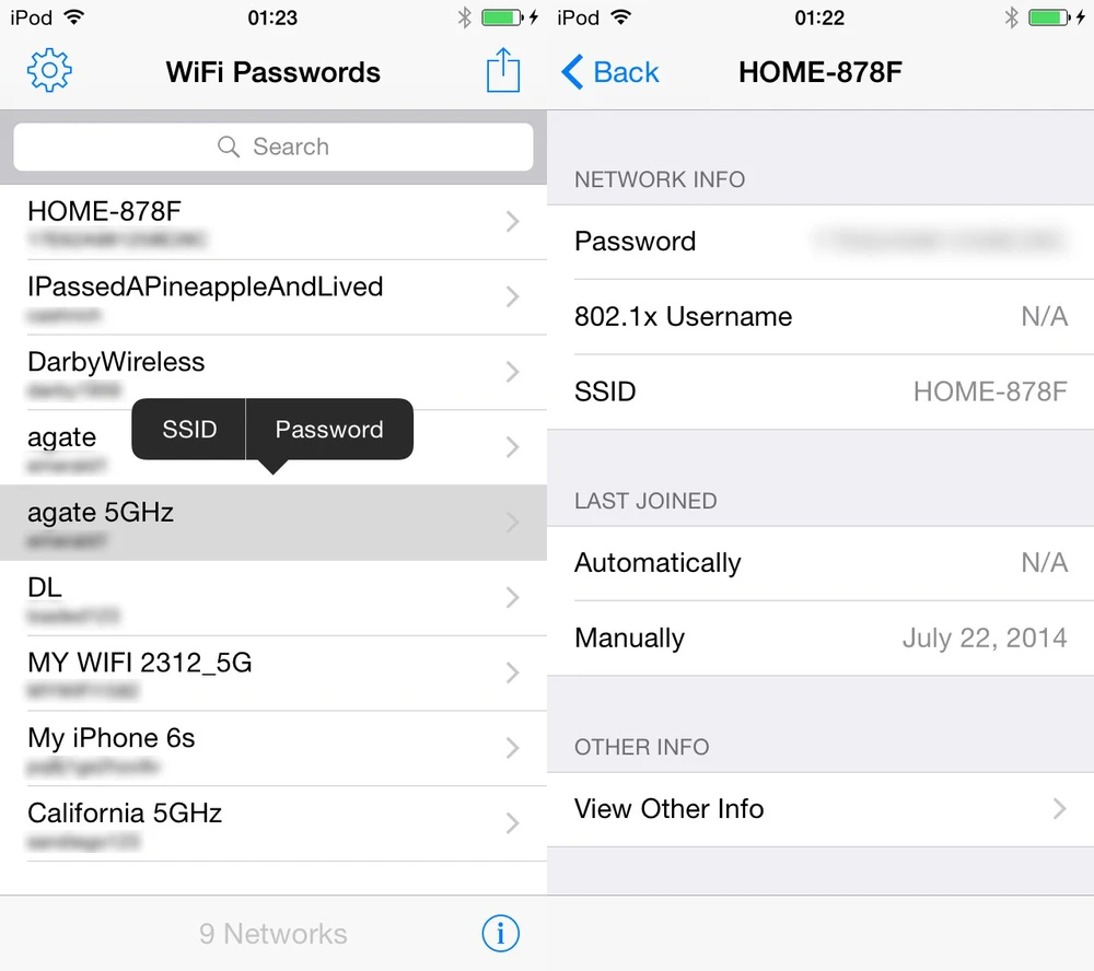 - Bước 2: Khi hoàn tất, ứng dụng sẽ tự động liệt kê toàn bộ Wi-Fi mà bạn đã từng kết nối trước đó (bao gồm mật khẩu). Lúc này, người dùng có thể sao chép lại mật khẩu và chia sẻ cho bạn bè.
