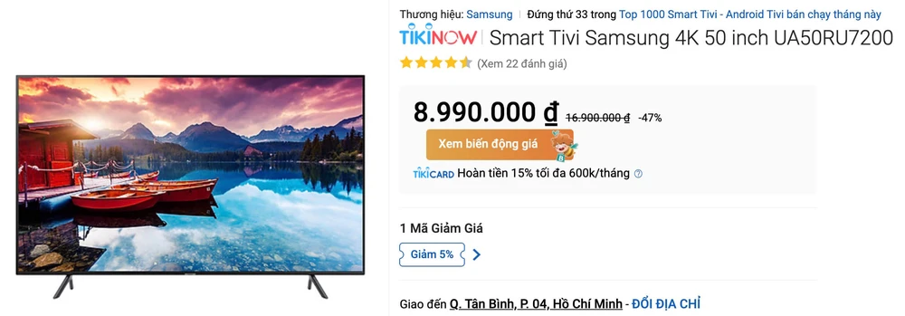 Giá tivi thông minh Samsung 4K 50 inch UA50RU7200 trên trang Tiki. Ảnh: TIỂU MINH