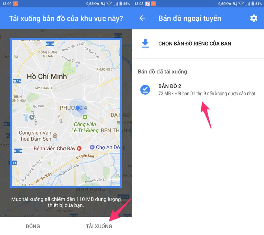 Lúc này, tự động ứng dụng sẽ lựa chọn một khu vực bất kỳ, tuy nhiên bạn có thể thay đổi vị trí, phóng to/thu nhỏ diện tích dễ dàng rồi nhấn Download để tải xuống và chờ một lát cho đến khi quá trình này kết thúc. Lưu ý, Google Maps chỉ cho phép tải về phần bản đồ có diện tích tối đa là 50 x 50 km và những dữ liệu này sẽ tự động bị xóa đi sau 30 ngày.