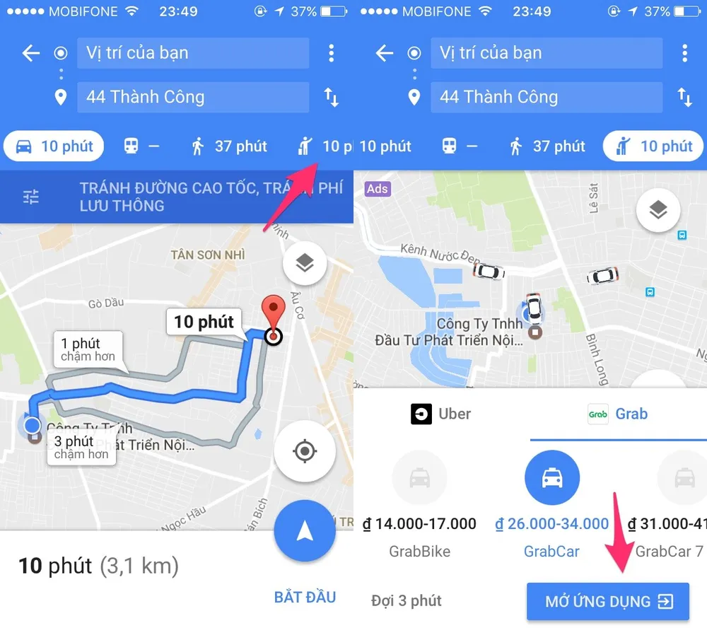 Để đặt xe giá rẻ, đầu tiên bạn hãy mở Google Maps, nhập vào địa điểm bắt đầu và kết thúc. Khi hoàn tất, người dùng chỉ cần nhấp vào biểu tượng hình người cầm valy ở góc trên bên phải. Lúc này, Google Maps sẽ hiển thị tất cả dịch vụ vận chuyển có sẵn trong khu vực của bạn, đồng thời ước tính giá cả tương ứng cho xe máy, xe bốn chỗ, xe bảy chỗ, xe chất lượng cao…