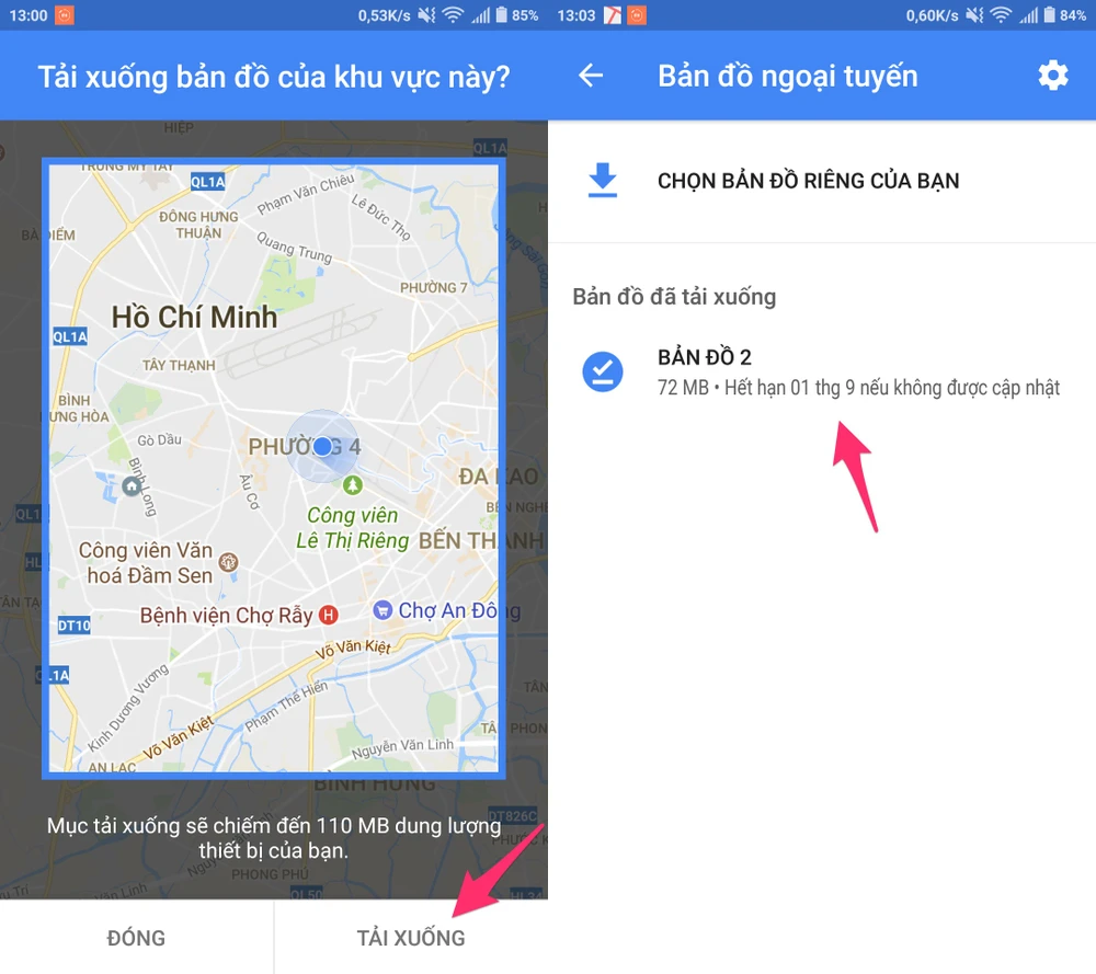 Để tiết kiệm dữ liệu di động (3/4G), nhiều người thường chọn giải pháp tải về các gói bản đồ offline để sử dụng khi không có Internet. Đối với các thiết bị Android, bạn hãy mở ứng dụng Google Maps, bấm vào biểu tượng menu ở góc trên bên trái và chọn Offline maps (bản đồ ngoại tuyến) > Select Your Own Map (chọn bản đồ riêng của bạn). Ngược lại, nếu đang sử dụng iPhone hoặc iPad, người dùng chỉ cần nhấp vào tùy chọn Offline Maps (các khu vực ngoại tuyến) > Custom Area (khu vực tùy chỉnh) và thực hiện tương tự.