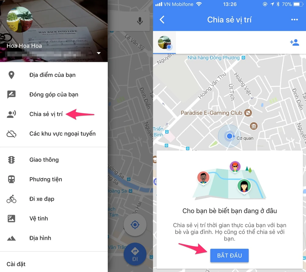 Đầu tiên, bạn nhấp vào biểu tượng menu ở góc trên bên trái và chọn Share location (chia sẻ vị trí) > Get Started (bắt đầu). Người dùng có thể chia sẻ vị trí hiện tại với bạn bè trong một khoảng thời gian cụ thể (mặc định là một tiếng), hoặc chọn Until you turn this off để chia sẻ vô thời hạn cho đến khi bạn chủ động tắt.