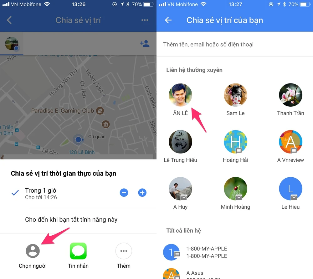 Tại mục Select People, bạn hãy nhập địa chỉ email hoặc số điện thoại của người cần chia sẻ vào khung trống. Nếu thấy xuất hiện thông báo Failed to load Location Sharing settings, người dùng chỉ cần gỡ ứng dụng Google Maps và cài đặt lại. Lưu ý, nếu không sử dụng được tính năng Share location (chia sẻ vị trí), bạn hãy chuyển ngôn ngữ trên điện thoại sang tiếng Anh.