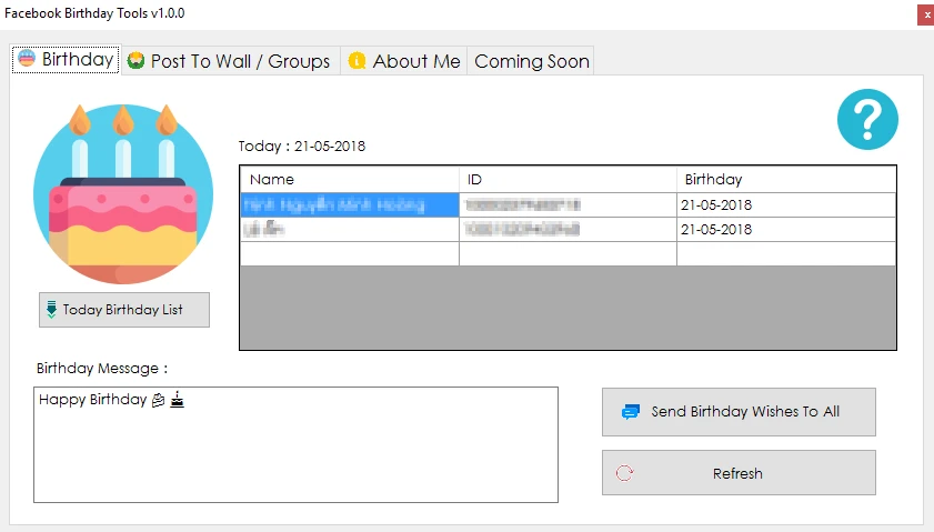 Việc chúc mừng sinh nhật từng người sẽ mất rất nhiều thời gian và công sức, để đơn giản hóa việc này, bạn có thể cài đặt phần mềm Facebook Birthday Tools tại địa chỉ http://bit.ly/fb-birthday-tools (chọn fire .rar, tải về và giải nén). Lưu ý, phần mềm đang trong giai đoạn Beta nên đôi khi sẽ phát sinh một số lỗi không mong muốn.