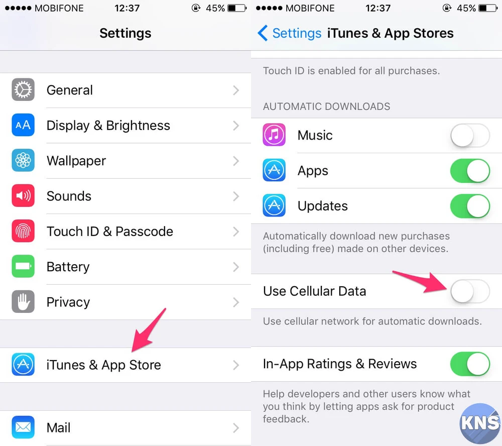 Đầu tiên, bạn hãy truy cập vào Settings (cài đặt) > iTunes & App Store và tắt tùy chọn Use Cellular Data (sử dụng dữ liệu di động) nhằm vô hiệu hóa tính năng cập nhật tự động bằng 3G/4G.