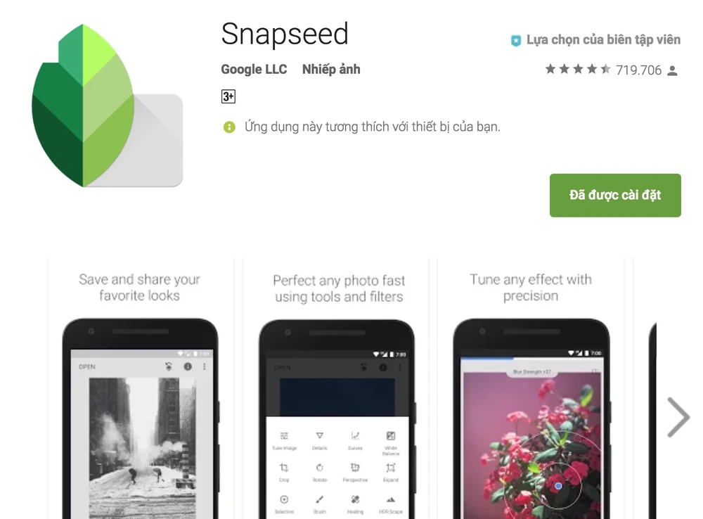 Snapseed hiện đang được cung cấp miễn phí tại https://goo.gl/RtAO6 (Android) hoặc https://goo.gl/NJFU6 (iOS). Về cơ bản, Snapseed cho phép người dùng chỉnh sửa màu sắc hình ảnh bằng cách thay đổi các thông số, sử dụng bộ lọc, bổ sung hiệu ứng...