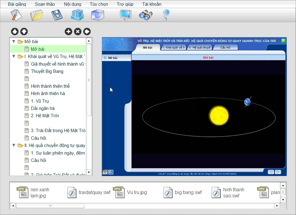 Violet là phần mềm hỗ trợ giáo viên tự soạn giáo án điện tử trên máy tính thay vì phải sử dụng giấy, viết như trước kia. Phần mềm cung cấp nhiều mẫu giáo án với giao diện đẹp mắt, hiệu ứng âm thanh sống động, phù hợp với mọi đối tượng học sinh từ cấp 1 đến cấp 3.