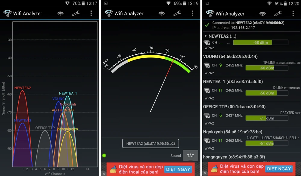 Ứng dụng được cung cấp hoàn toàn miễn phí tại địa chỉ https://goo.gl/MpiuBH, tương thích với các thiết bị chạy Android 2.3 hoặc cao hơn. Đầu tiên Wifi Analyzer sẽ kiểm tra các mạng WiFi xung quanh và channel (kênh) tương ứng, sau đó tiến hành phân tích cường độ tín hiệu ở dạng đồ thị.