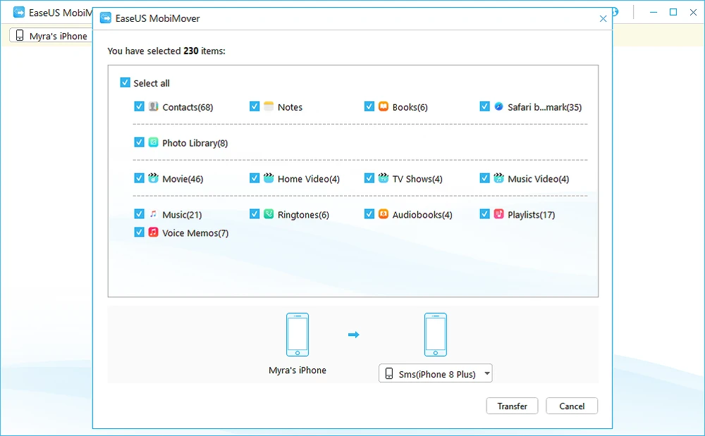 Khi hoàn tất, bạn hãy kết nối cả hai chiếc điện thoại vào máy tính, sau đó nhấp vào tùy chọn Transfer to Other Device, lựa chọn thiết bị nguồn (iOS) và đích (Android) hoặc ngược lại, sau đó chọn các dữ liệu cần chuyển như Contacts (danh bạ), Notes (ghi chú), Books (sách), Photo Library (thư viện hình ảnh), Media (các tập tin đa phương tiện)… Cuối cùng nhấn Transfer và chờ một lát cho đến khi quá trình này kết thúc.