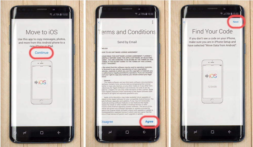 Trên smartphone Android, bạn cũng cài đặt Move to iOS trên Google Play, mở ứng dụng và bấm Continue > Agree > Next. Tại màn hình Enter Code, người dùng chỉ cần điền vào sáu con số hiển thị trên iPhone, nếu chính xác, hai thiết bị sẽ tự động kết nối.