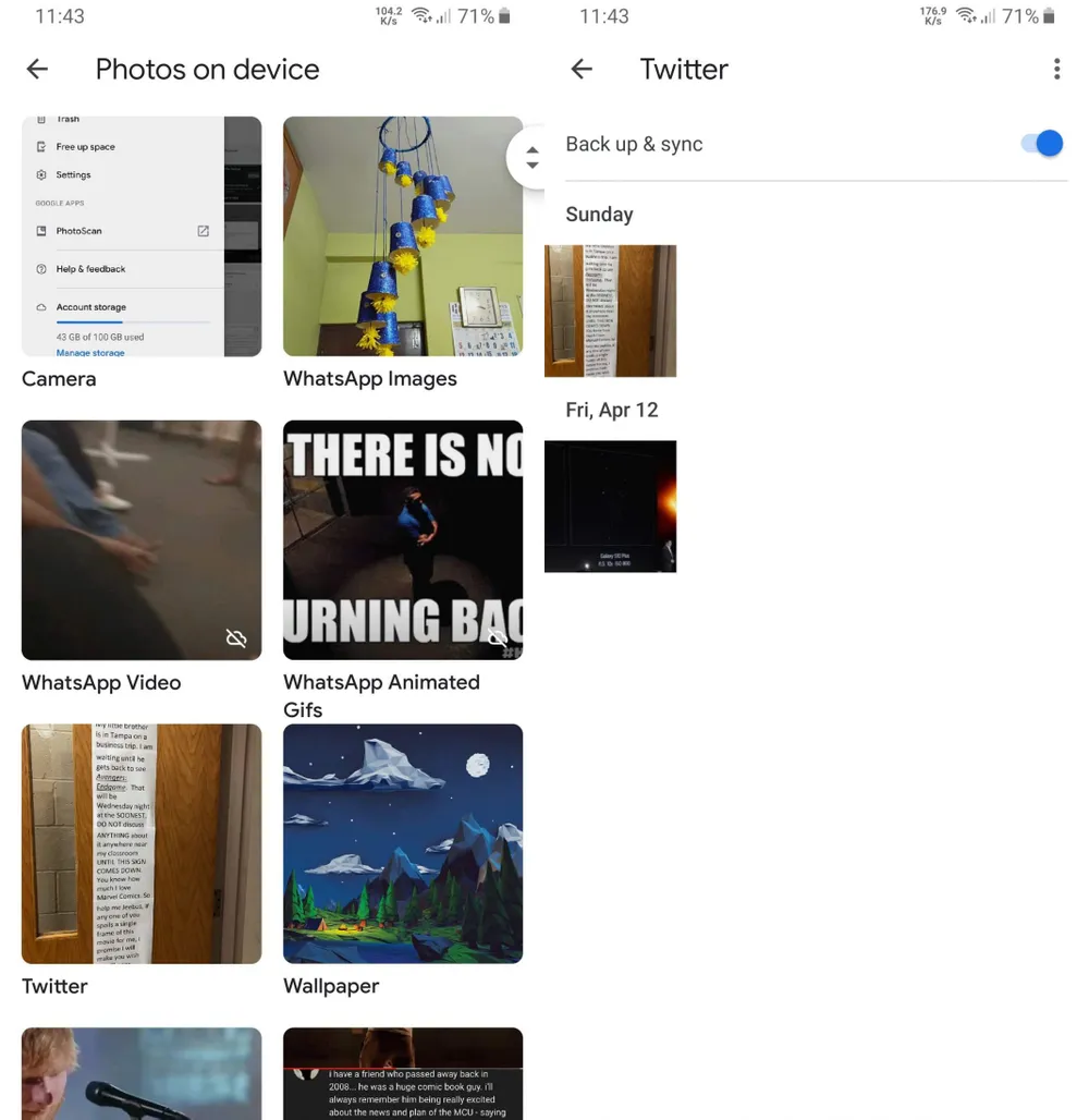 Phần này sẽ hiển thị tất cả thư mục trên thiết bị của bạn, bao gồm cả hình ảnh và video. Việc bạn cần làm là chọn các thư mục cần sao lưu và chuyển sang điện thoại mới, sau đó bật tùy chọn Back up and syns (sao lưu và đồng bộ hóa) ở trên cùng.