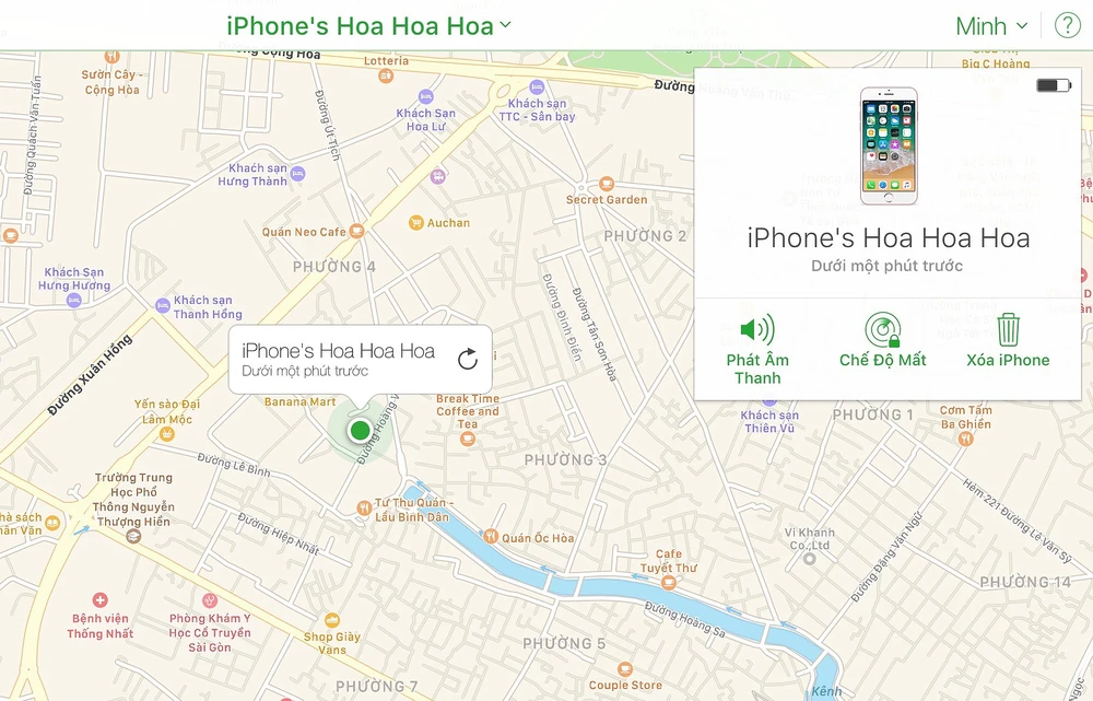 Lúc này trên bản đồ sẽ hiển thị vị trí của iPhone/iPad. Tại đây, người dùng cũng có thể kích hoạt Lost mode (chế độ mất) hoặc xóa dữ liệu từ xa nếu cảm thấy cơ hội tìm lại thiết bị chỉ bằng con số 0.