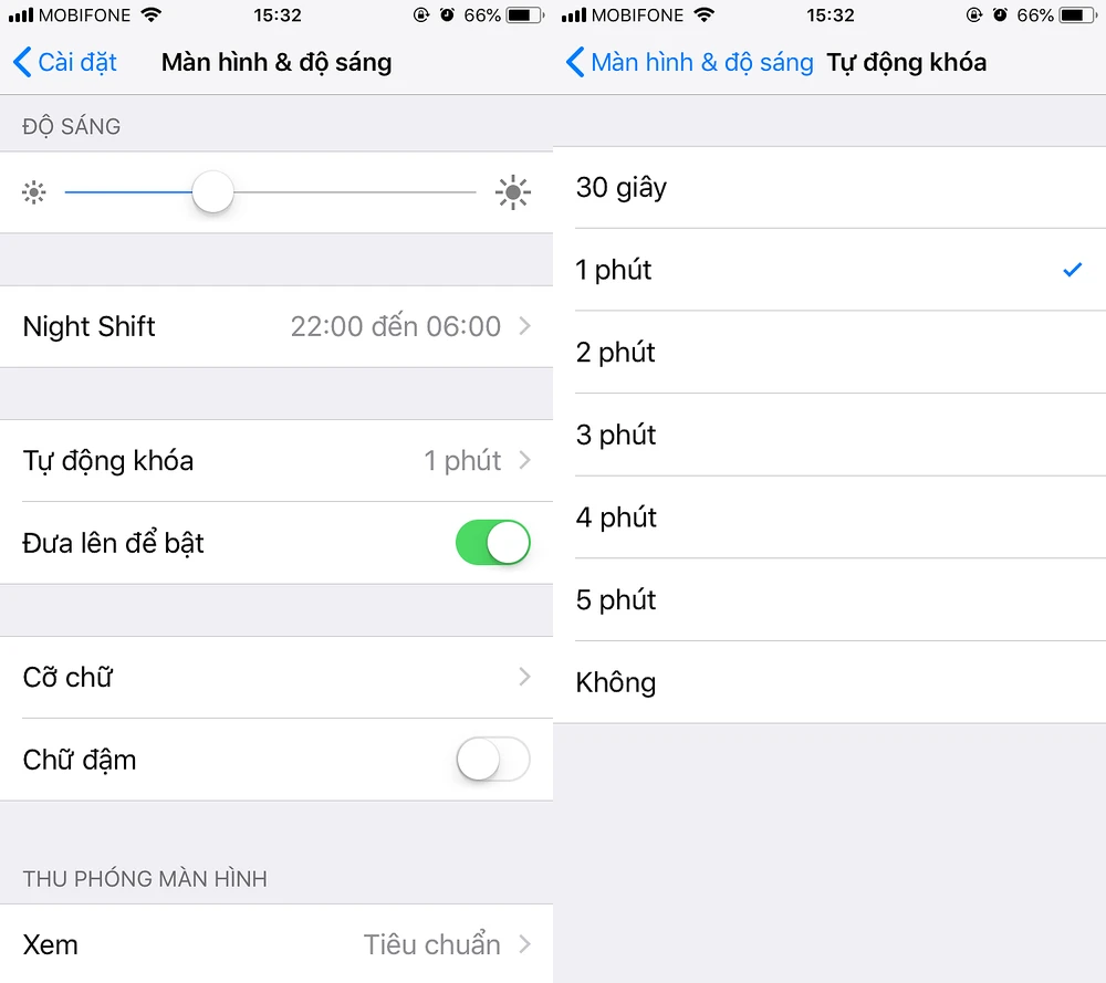 Bên cạnh đó, bạn cũng nên kích hoạt tính năng Auto lock (tự động khóa) màn hình trong phần Settings (cài đặt) > Display & Brightness (màn hình & độ sáng). Trong cửa sổ tiếp theo, bạn hãy lựa chọn khoảng thời gian tự động khóa thiết bị, đơn cử như 30 giây, 1 phút, 5 phút…