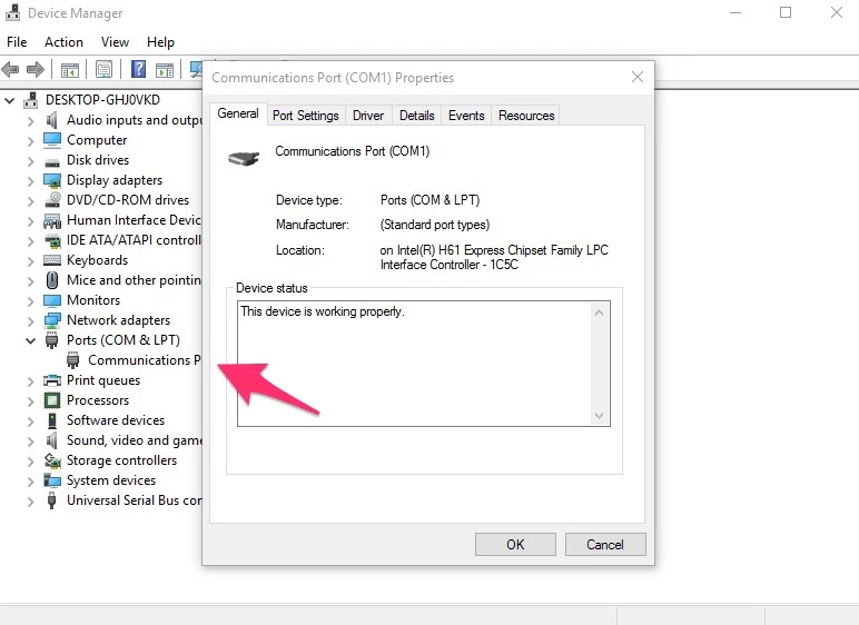 - Bước 1: Bạn hãy kích phải chuột vào My computer (hoặc This PC) và chọn Properties > Device manager > Ports > Communications Ports.