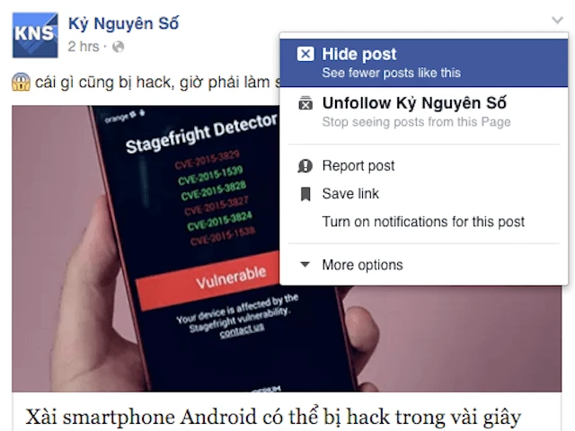 Nếu không thích một bài viết trên News feed, bạn có thể ẩn nó đi bằng cách nhấp vào mũi tên ở góc phải bài viết và chọn Hide post. Việc này cũng sẽ giúp giảm tần suất xuất hiện những bài viết tương tự trong tương lai.