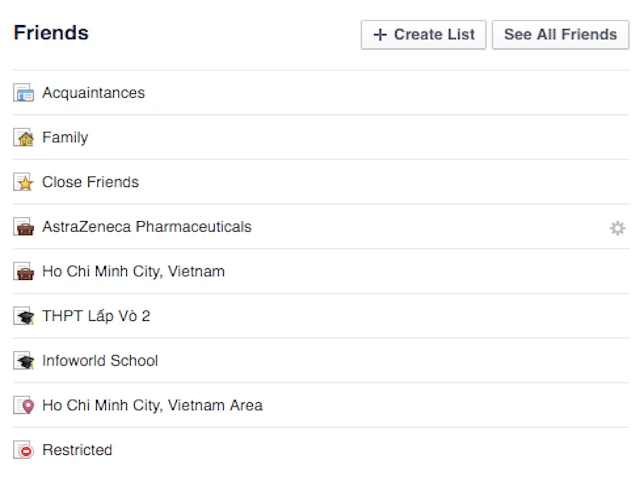 Mặc định, Facebook có sẵn các Interest List như Family (Gia đình), Close Frends (Bạn thân). Đặt biệt, Restricted là Interest List dành cho những người bạn đã kết bạn, nhưng là những người bạn không muốn chia sẻ mọi thứ bạn đăng lên Facebook.