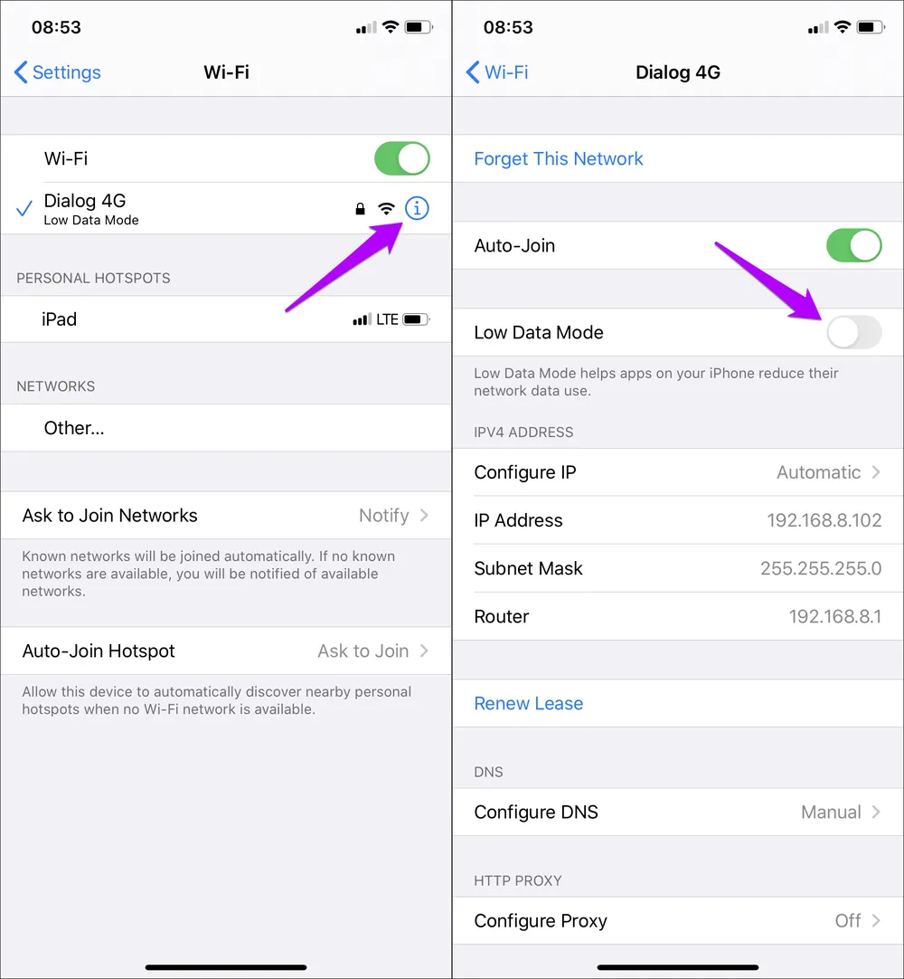 Để vô hiệu hóa chế độ dữ liệu thấp, bạn hãy vào Settings (cài đặt) - Wi-Fi, bấm vào biểu tượng chữ “i” bên cạnh mạng Wi-Fi đang sử dụng, sau đó tắt tùy chọn Low data mode (chế độ dữ liệu thấp).