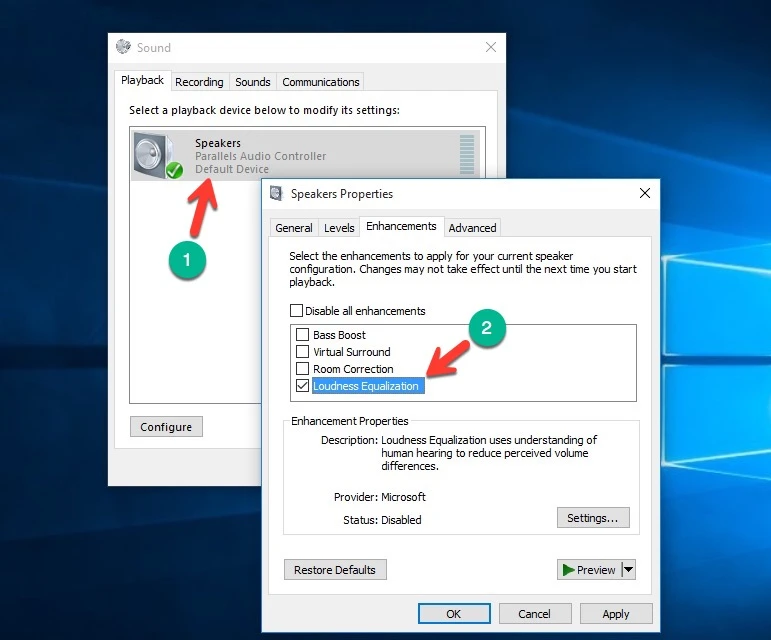 - Bước 3: Cuối cùng người dùng chỉ cần chuyển sang thẻ Enhancements, đánh dấu vào ô Enable Loudness equalization, nhấn Apply > OK để lưu lại.