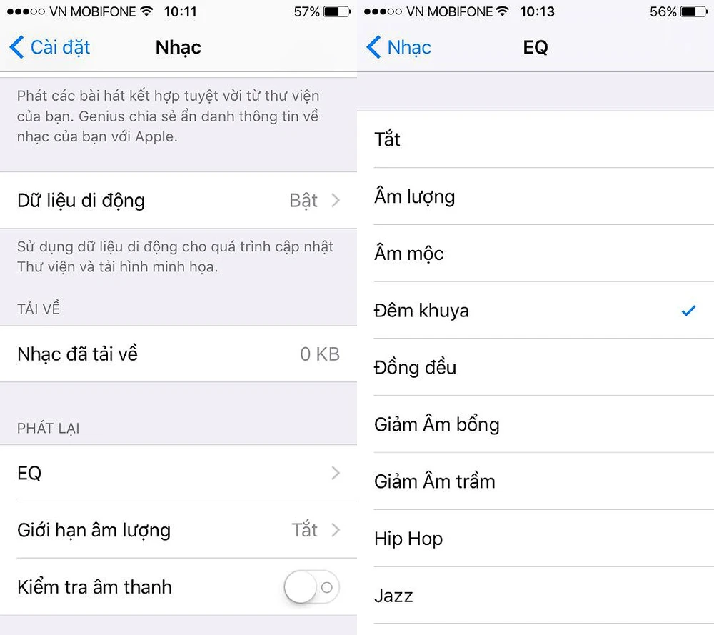 Bên cạnh đó, bạn cũng có thể vào Settings (cài đặt), kéo xuống bên dưới và chọn Music (nhạc) > EQ > Late Night (đêm khuya). Lưu ý, nếu không thấy xuất hiện tùy chọn Music (nhạc), người dùng chỉ cần mở App Store và cài đặt lại ứng dụng. Ngoài Late Night (đêm khuya), tại đây vẫn còn rất nhiều chế độ để bạn lựa chọn, đơn cử như Âm mộc, Đồng đều, Hip Hop, Jazz, La tinh, Nhạc cổ điển, Pop…
