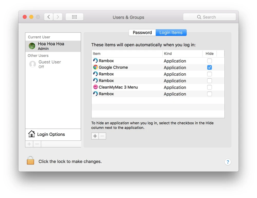 Để tắt các ứng dụng chạy nền trên macOS, bạn hãy mở Settings > Users & Groups > Login Items và bỏ chọn hoặc nhấn dấu trừ để loại bỏ hoàn toàn.